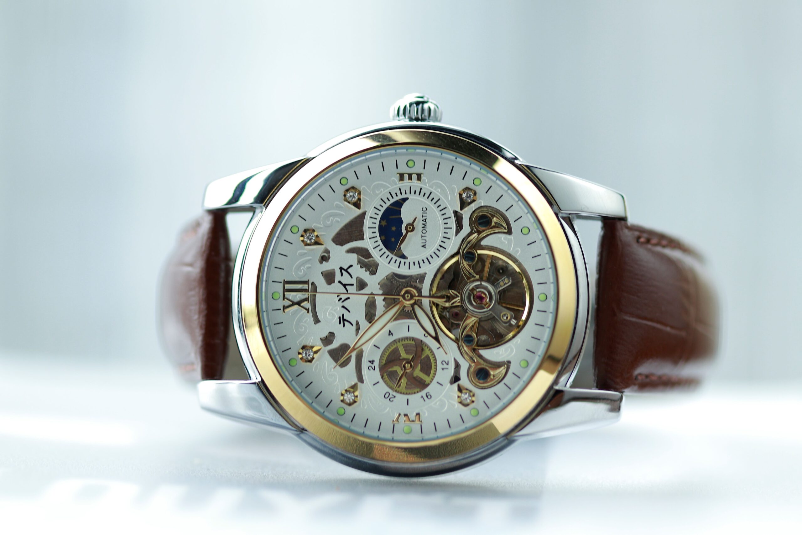 Đồng Hồ Cơ テバイス M15, Khung DMI Vàng, Mặt trắng, Dây Da Nâu